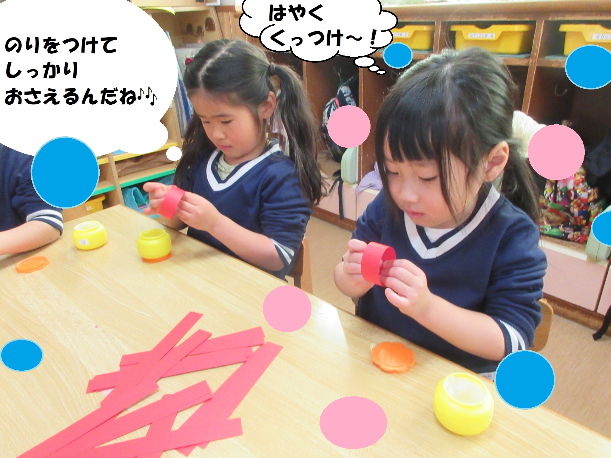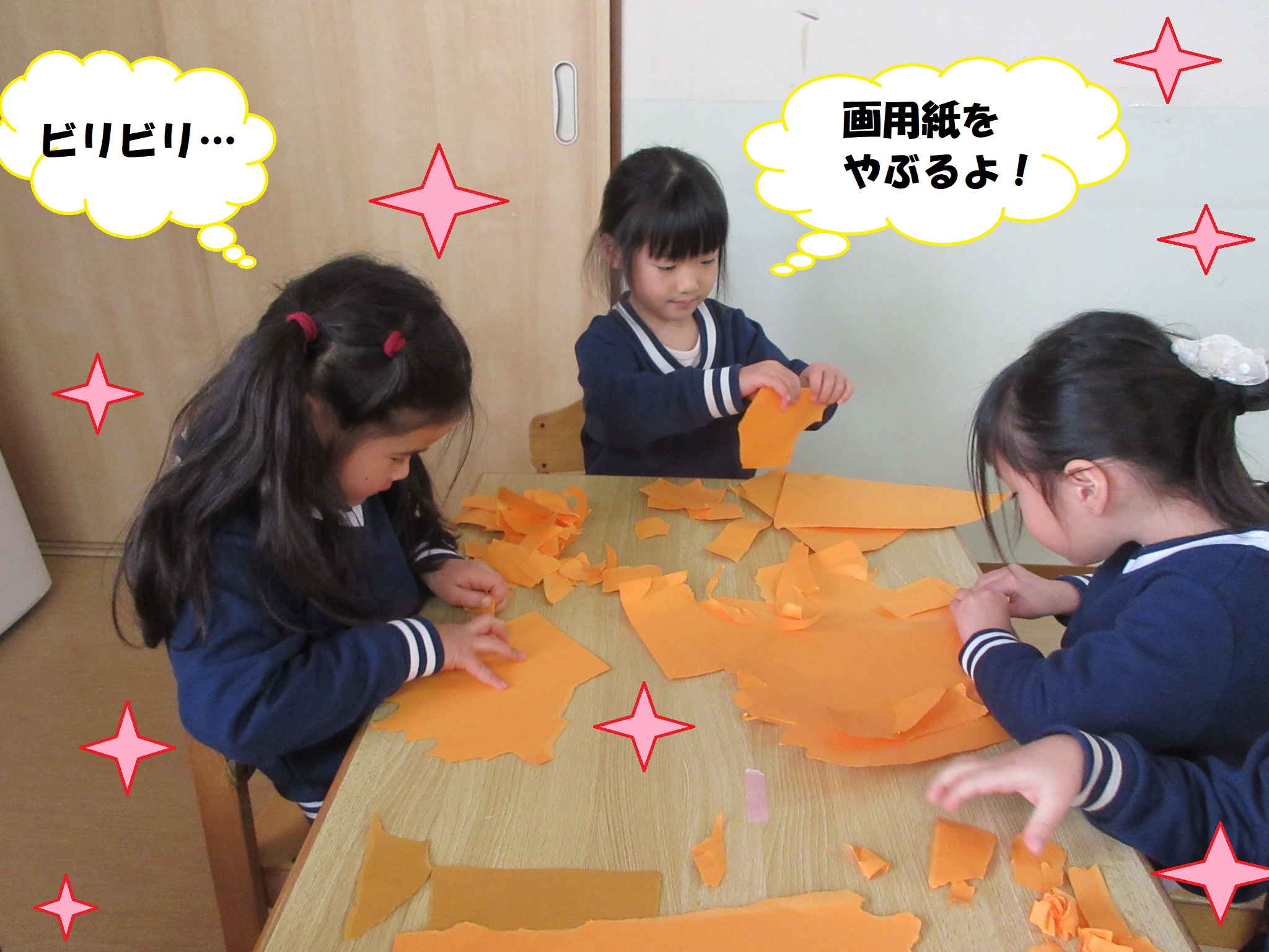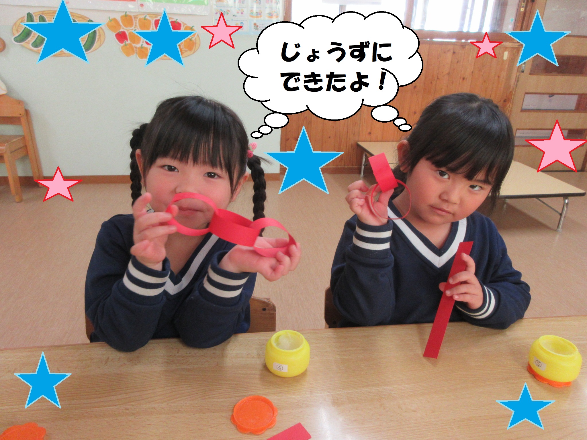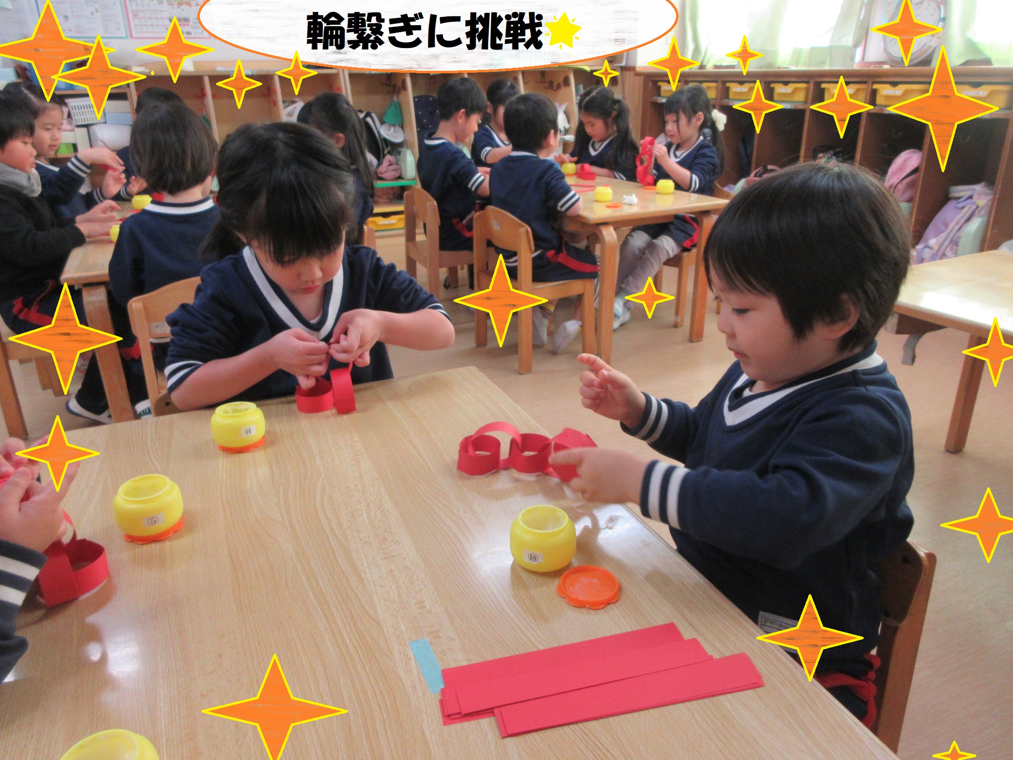 輪つなぎや、画用紙をちぎる活動では指先を使い集中して取り組んでいましたよ★