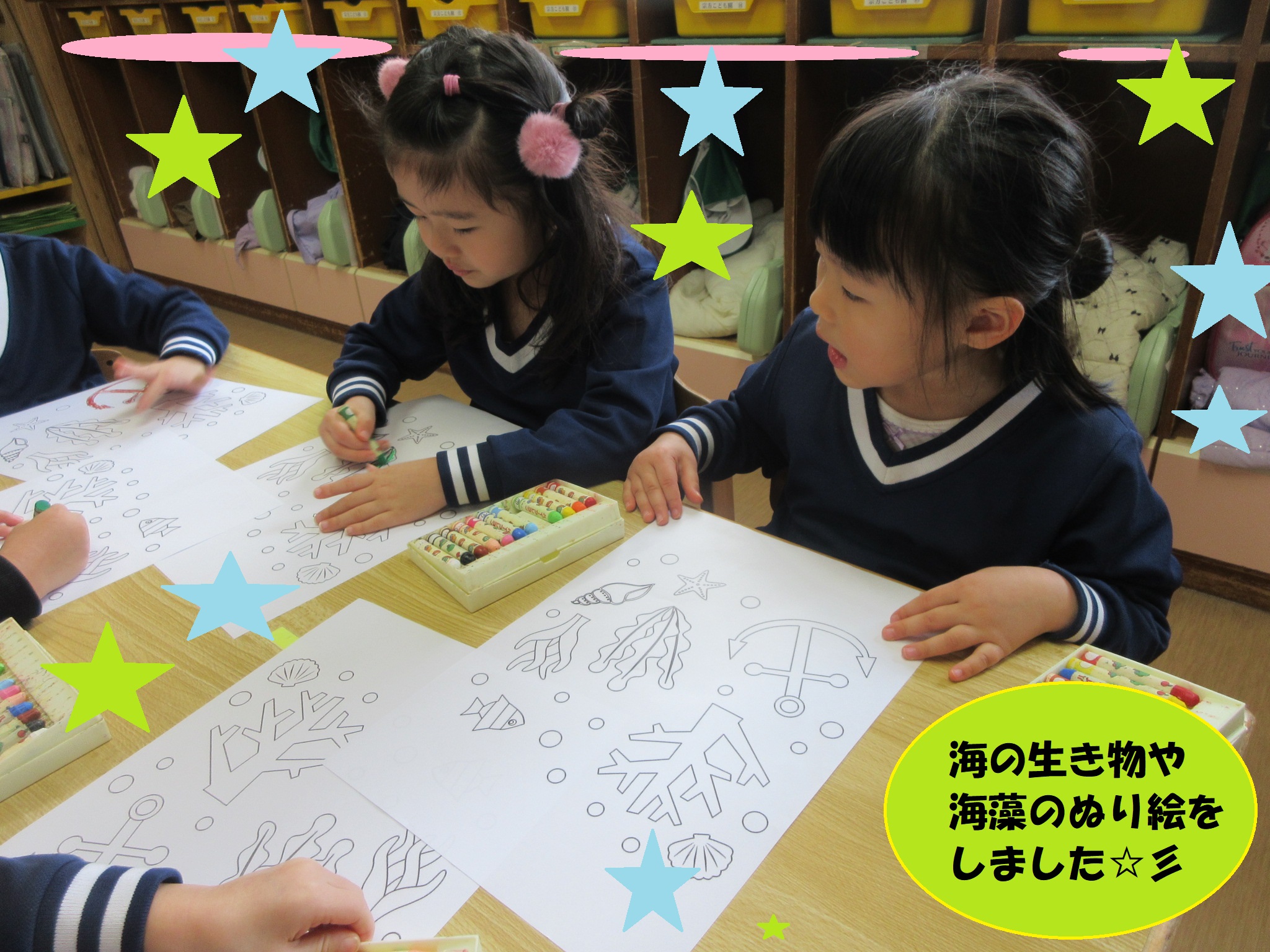 色塗りでは、魚や海藻などを好きな色でぬる姿が見られました♪