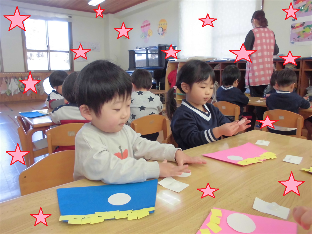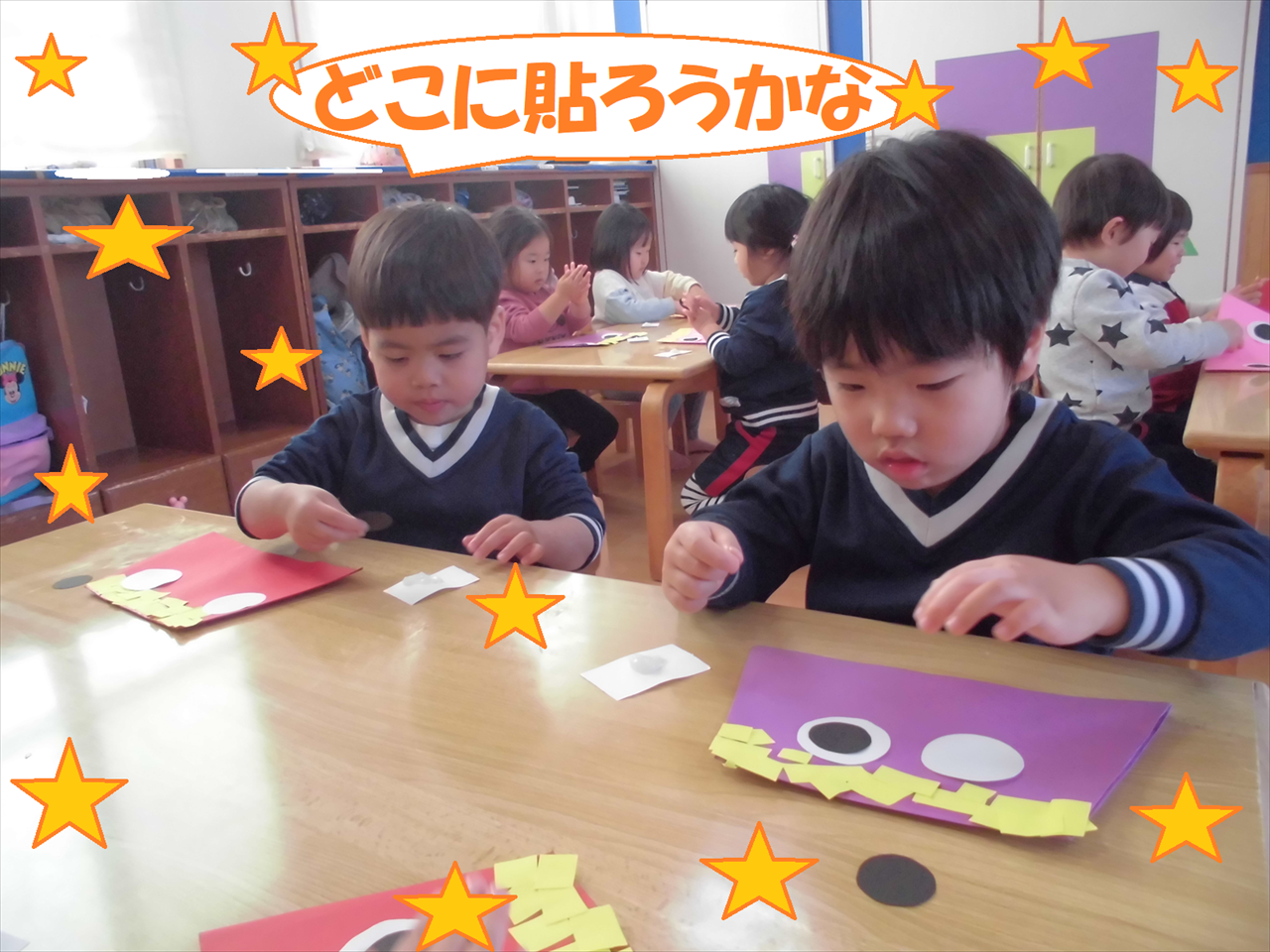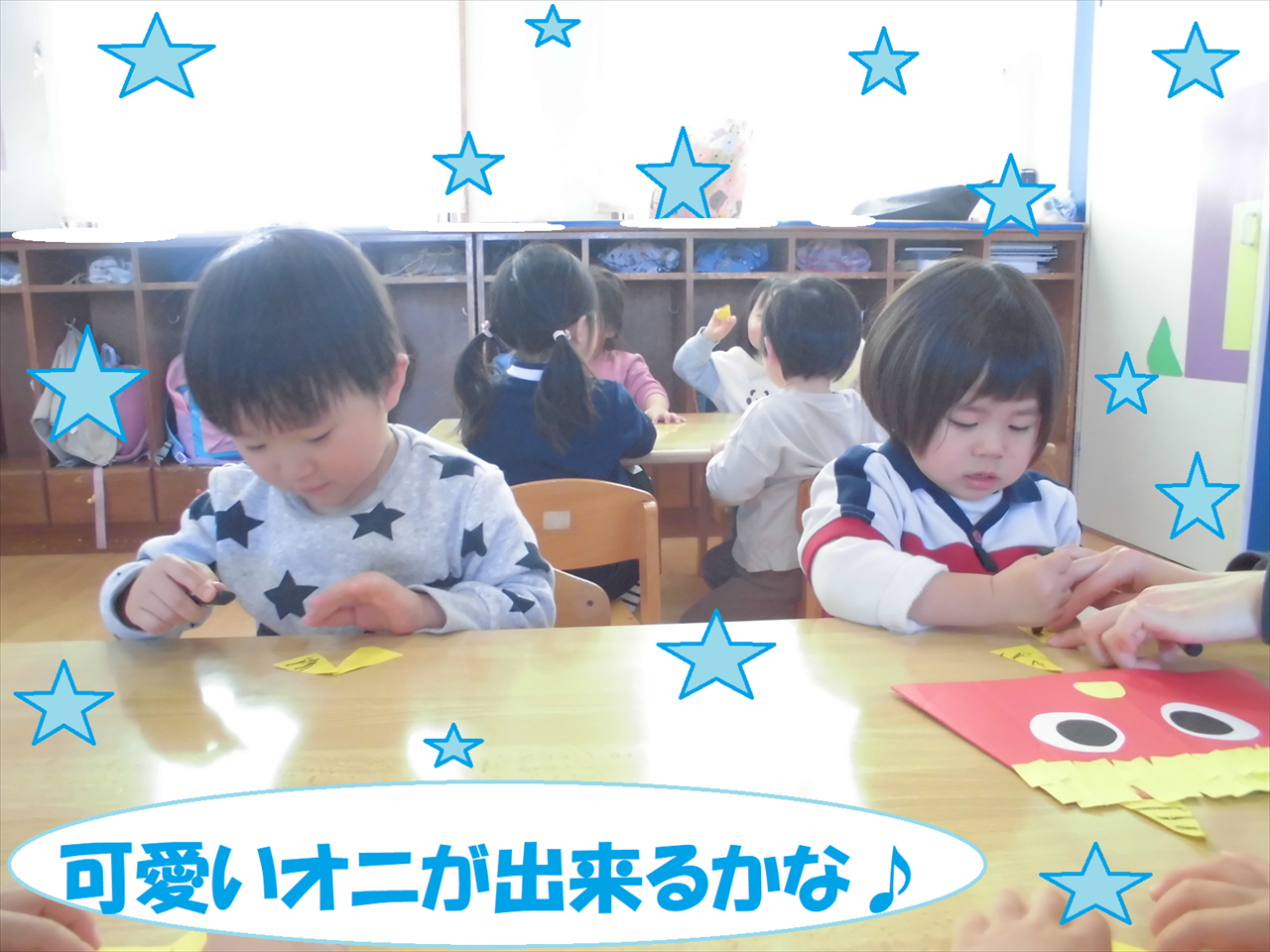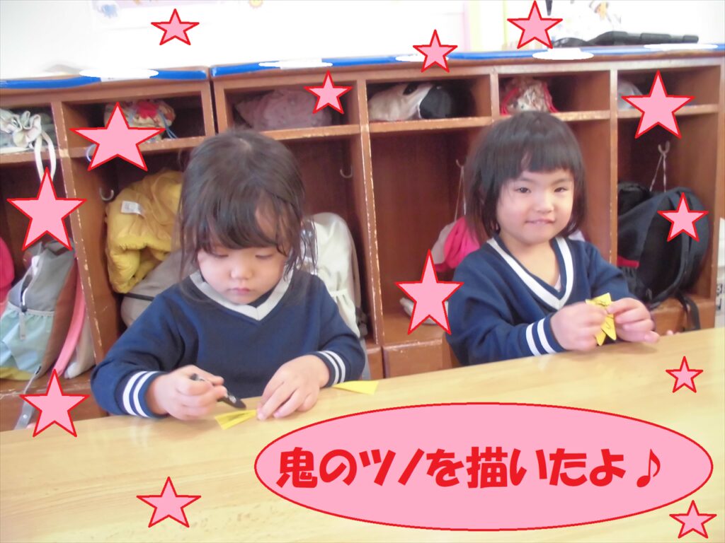 節分製作を行い、クレヨンやのりを使って