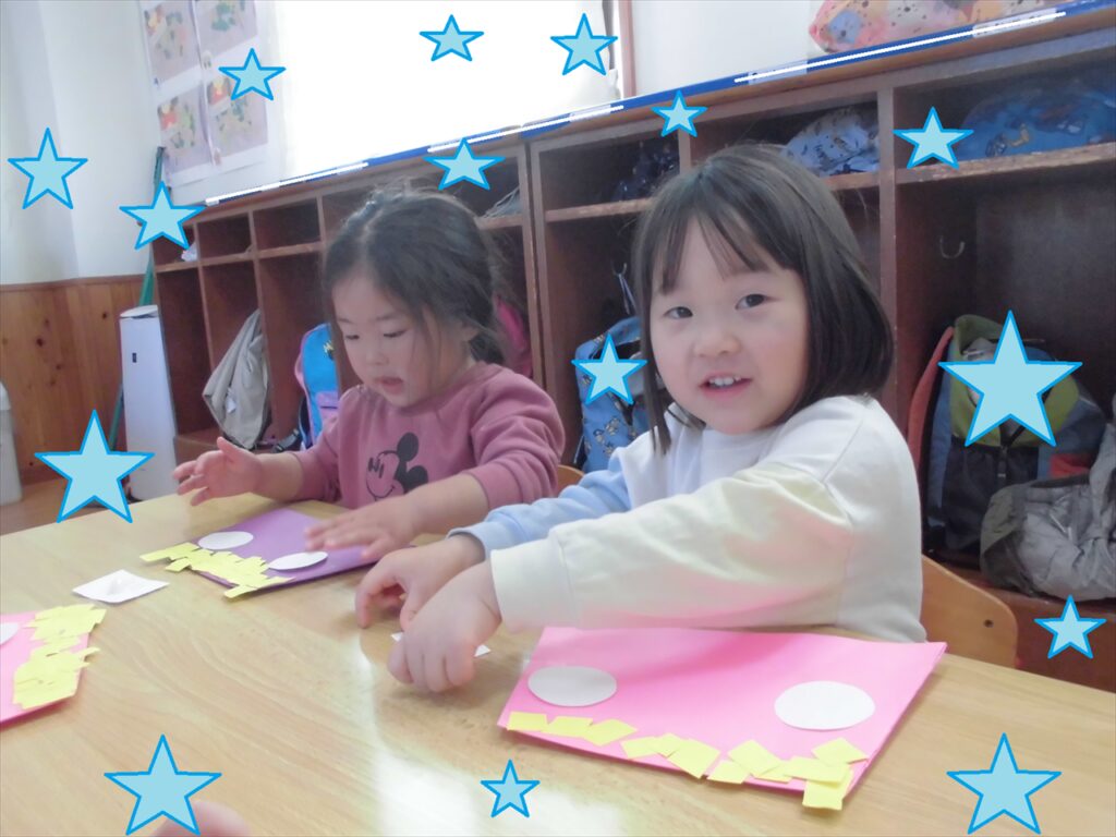 のりを使って顔のパーツも貼り、出来上がると