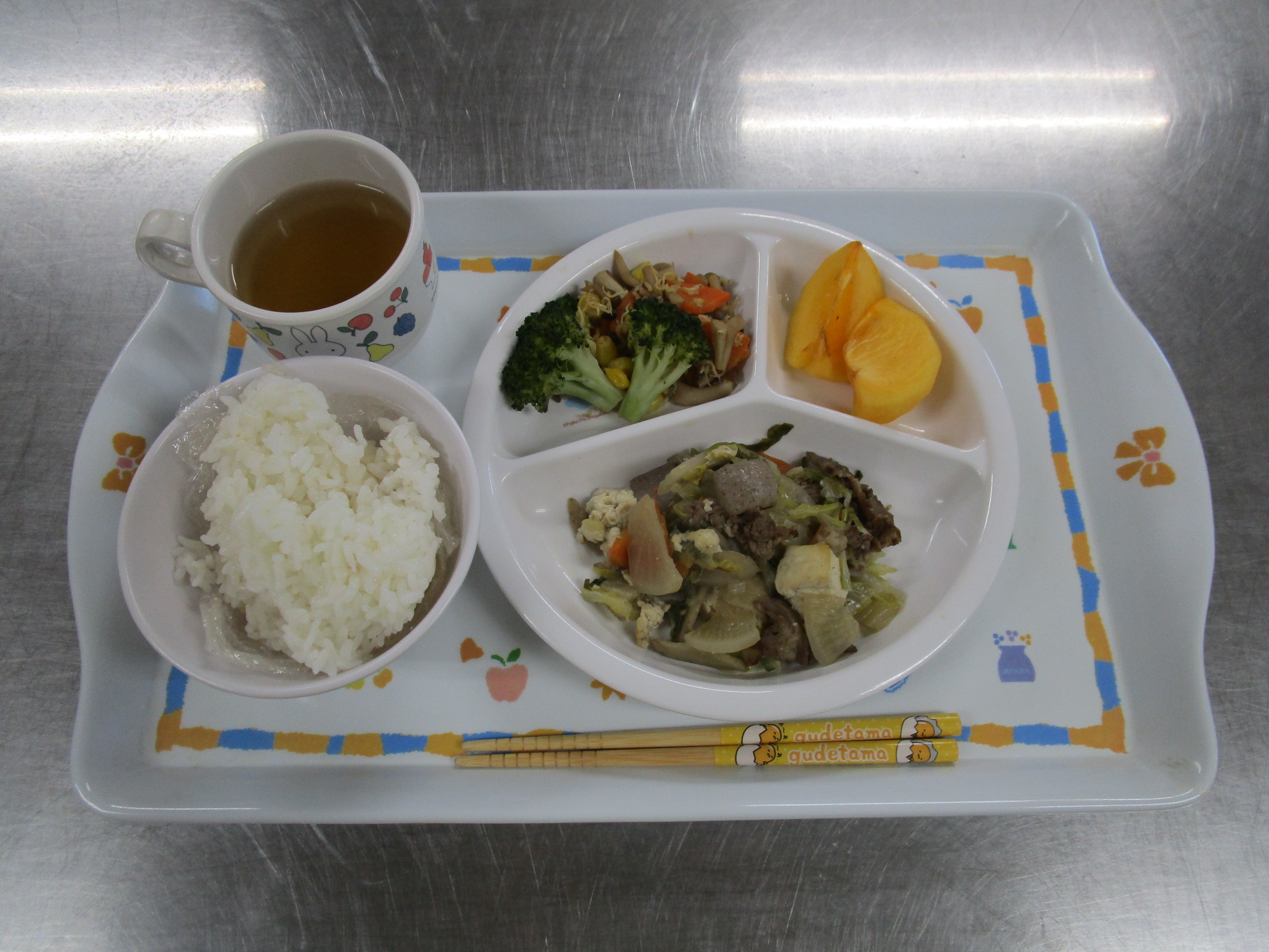 ・大豆入りひじきの油炒め ・ししゃも ・南瓜のオーブン焼き ・オレンジ ・ごはん