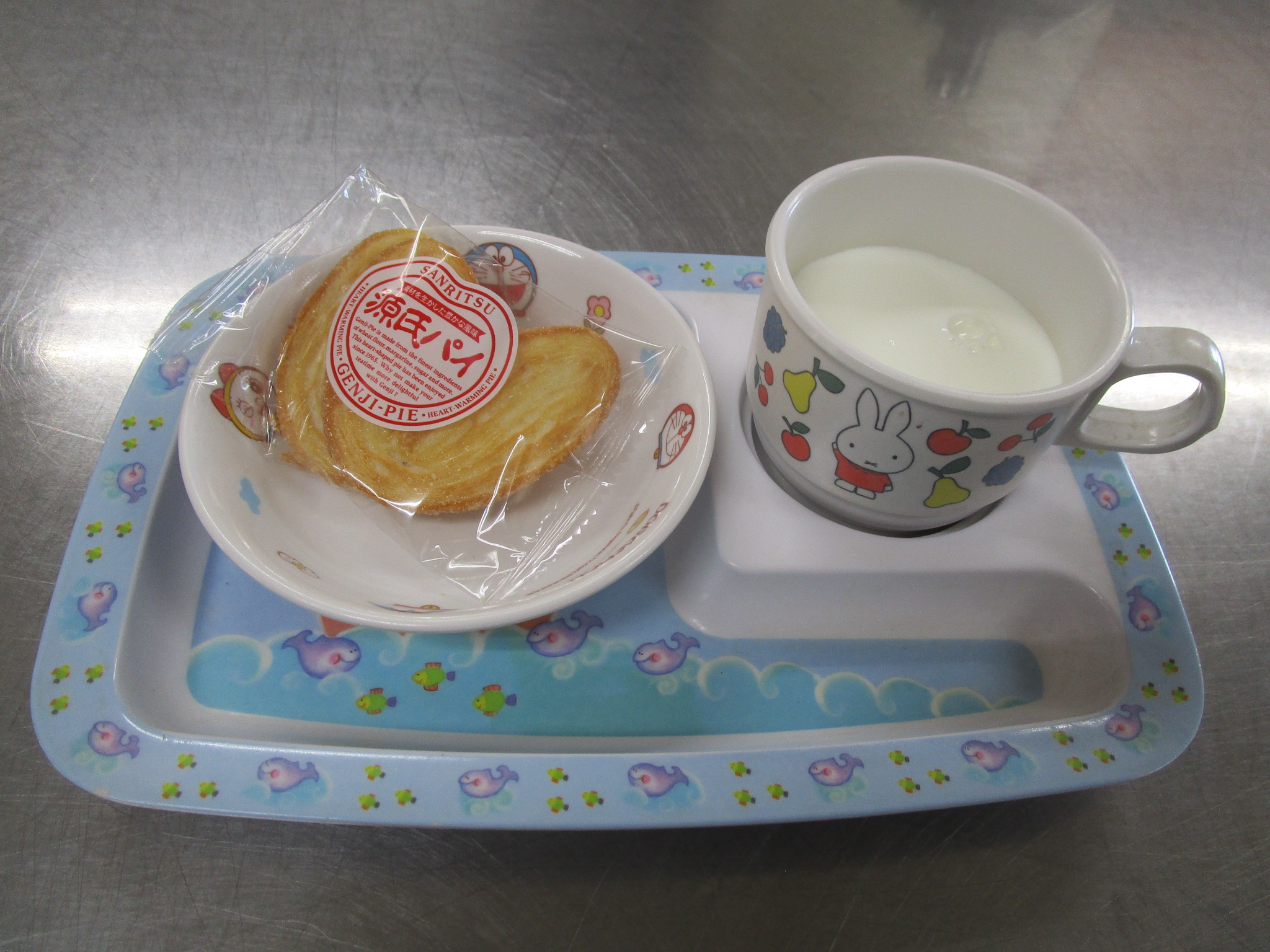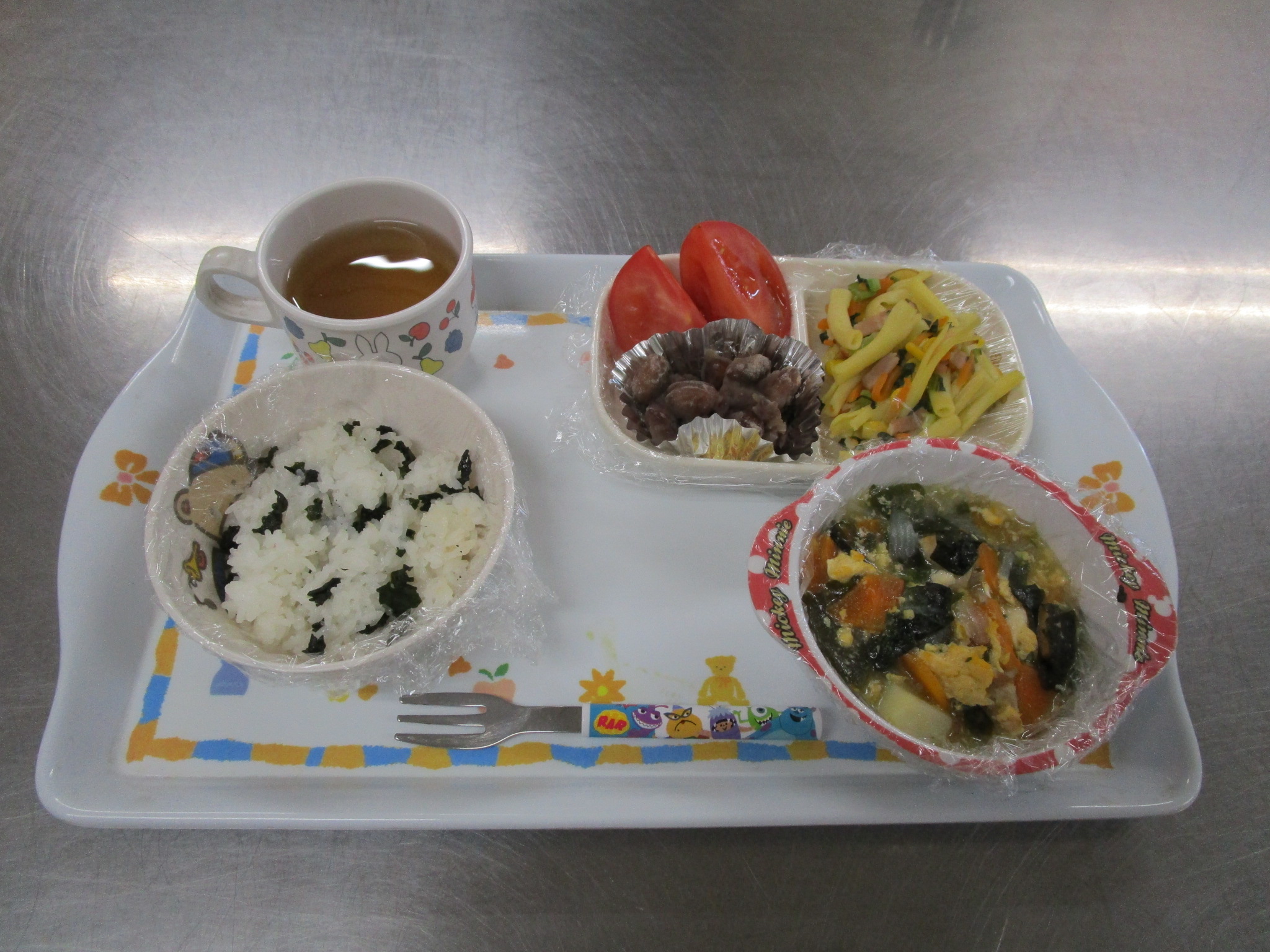 2020.04.10 ◎今日の給食・おやつ *゚*゚ レバーのみそ煮 *゚* 給食 ・レバーのみそ煮 ・野菜のオーロラ和え ・スナップエンドウ ・トマト ・ごはん おやつ ・せんべい ・ヨーグルト ・牛乳